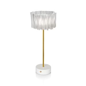Slamp Accordéon Battery LED-Tischleuchte umfasst ein transparenter Schirm – für eine gleichmäßige Lichtabgabe – mit einem satinweißen Finish, einem weißen oder mattschwarzen Fuß und einem halbmatt-satinierten eloxierten Aluminiumstab in Bronze, der der Lampe Stabilität verleiht. Die Serie Accordéon entstand aus Marc Sadlers Forschungen zu den grenzenlosen Möglichkeiten, die Slamp-Technopolymere bieten. Ob Stofffalten oder Akkordeonbälge, die Kollektion markiert zu Recht den Beginn eines neuen modernen Erzählstrangs, in dem Mode, Handwerk und Technologie eine untrennbare Einheit bilden. Perfekt, um ein Abendessen zu zweit zu beleuchten oder sich für eine Veranstaltung anzustellen. Der Akku ermöglicht bei geringster Helligkeit bis zu 60 Stunden autonome Laufzeit und kann auch an der separat erhältlichen Mehrfachladestation aufgeladen werden.