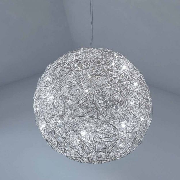 Die Pendelleuchte Fil de Fer ist ein wahres Meisterwerk aus der Feder von Enzo Catellani und kann durchaus als moderne Interpretation eines Kronleuchters gesehen werden. Die verschlungene Struktur aus poliertem Aluminiumdraht in Kombination mit den vielen kleinen LED-Birnen lässt einen einzigartigen Lichteffekt entstehen und erinnert so gewollt an die Unendlichkeit des Universums. Dadurch kann Fil de Fer problemlos als zentrale Raumbeleuchtung, sowie als optisches Highlight in großen und offenen Räumen oder Galerien eingesetzt werden. Wie bei allen Leuchten aus dem Hause Catellani & Smith wurde natürlich auch bei Fil de Fer höchster Wert auf Qualität und Exklusivität gelegt. Jede Leuchte dieser Serie wird in Handarbeit gefertigt und ist somit ein einmaliges Unikat. Die Familie Fil de Fer umfasst zudem auch ein großes Sortiment an Decken-, Boden-, und Außenleuchten.