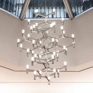 Die Kunstwerke von M.C. Escher waren es, die Markus Jehs und Jürgen Laub zur Crown Summa inspirierten. Bei Eschers Werken eröffnen nie endende Verbindungen immer wieder neue Perspektiven, bei jeder Betrachtung, aus jedem Winkel. Mit der modularen Struktur wurde bei Crown Summa dieser Gedanke perfekt umgesetzt. Die sandgestrahlten Diffusorgläser erzeugen den Eindruck von im Raum schwebenden Kerzen und rufen durch ihre gezielt asymmetrische Anordnung staunende Blicke hervor. Angenehmes Licht verteilt sich sanft nach oben und erfüllt so den Raum voll angenehmer Helligkeit. Mit einer Höhe von 160 cm und einem Umfang von 115 cm wird der Kronleuchter als optisches Highlight der strahlende Mittelpunkt jeder Empfangshalle. Die Struktur aus hochwertigstem Aluminiumdruckguß kann glänzend poliert, matt weiß oder schwarz oder goldfarben lackiert geliefert werden. Für exklusivste Ansprüche ist der Kronleuchter auch in einer vergoldeten Variante verfügbar. Wahlweise können Sie den Nemo Crown Summa mit Halogen- oder LED-Lampen ausstatten. Ausführungen mit mehreren Etagen können getrennt geschaltet werden. Auf Anfrage ist diese Leuchte auch mit einem roten Textilkabel lieferbar (Standard ist ein transparentes Kabel).