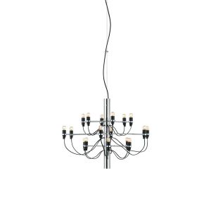 Der 2097/18 Kronleuchter aus dem Hause Flos wurde vom italienischen Designer Gino Sarfatti entworfen, welcher sich am Design klassischer Lüster orientiert und dieses in ganz neue Form bringt. Hergestellt wird diese schöne Leuchte in einem massiven, vertikal ausgerichteten Eisenstab als zentrale Basis und insgesamt 18 filigranen, gleichmäßig übereinander angeordneten Armen aus Messing mit jeweils einem Leuchtmittel am Ende. Durch die feine Oberflächenveredelung in hochglänzendem Chrom oder Messing sowie in matt Schwarz besitzt der 2097/18 Kronleuchter von Flos ein schickes Aussehen und wertet sowohl modernes als auch klassisches Interieur exklusiv auf. Zudem geben die frei hängenden Kabel der Leuchte einen trendigen, industriellen Look und komplettieren die moderne Ästhetik. Für ein harmonisches Gesamtbild kommt der 2097/18 Kronleuchter von Flos inklusive passenden LED-Leuchtmitteln, welche wahlweise mit klarer oder matter Birne erhältlich sind. Stabil aufgehängt am Deckenbaldachin mit einem ca. 2,8 Meter langen Stahlseil eignet sich die Leuchte sehr gut für hohe Räume wie etwa in klassischen Altbauten und bietet speziell an rein weißen Stuckdecken einen tollen Stil-Mix. Der 2097/18 Kronleuchter von Flos schmückt wunderbar private Wohnzimmer sowie repräsentative Geschäftsräume und sorgt zugleich für eine gepflegte Atmosphäre.
