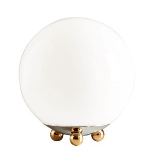 Ursprünglich stammt diese, um 1930 entstandene Leuchte, von einem Flohmarkt in Paris, deren Entwickler Tecnolumen nicht bekannt ist. Die opale Glaskugel ruht auf einer verchromten Schale, die von drei Messing- oder Chromkugeln getragen wird. Die Kugeln sind gleichzeitig Füße und Arretierungen für die Glaskugel, die durch sie festgeschraubt wird. Reizvoll ist der geschmackvolle Wechsel der Oberflächen Chrom, Messing und Glas bei der gleichbleibenden Kugelform. Beleuchtet wird das schlichte Wohnaccessoire mit einem Halogenleuchtmittel, sodass ein gedecktes, gleichmäßiges Licht die Räumlichkeiten warm erstrahlen lässt.